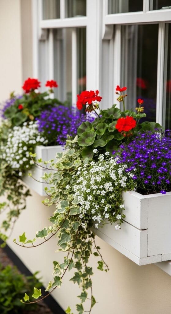 Wooden window boxes cost $20–$50 depending on size. Fill with a mix of annuals and trailing ivy for season-long color. Geraniums, petunias, and bacopa are reliable, affordable performers that fill out quickly and bloom all season.