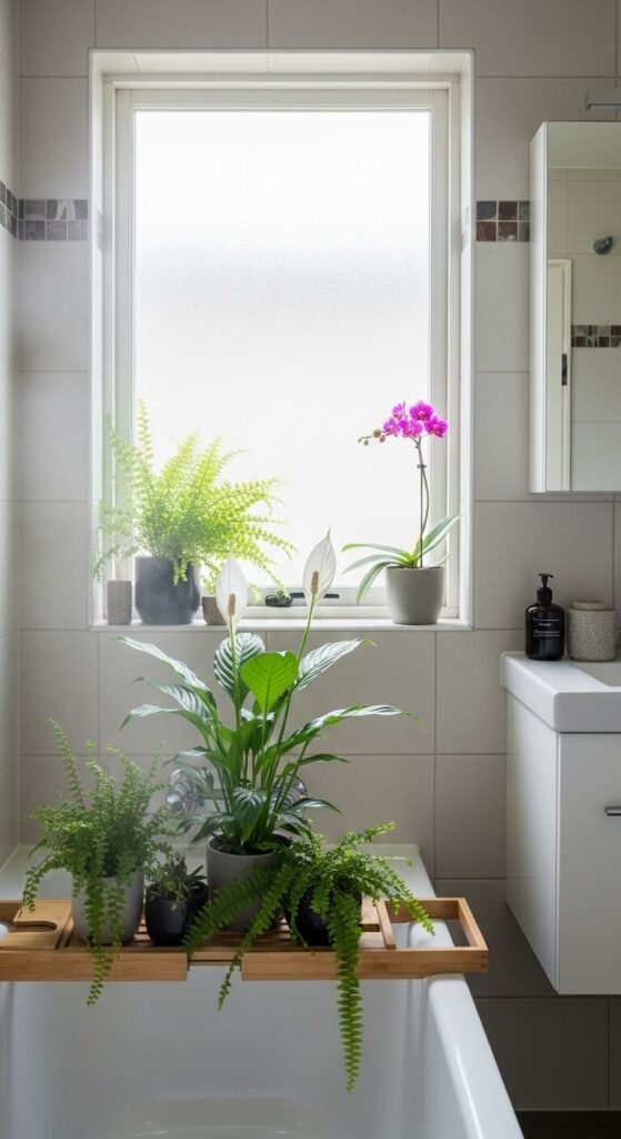 Place a peace lily on a shelf near the window — it tolerates low light and actually filters indoor air pollutants like ammonia and benzene. A small fern on the vanity costs under $8 at most garden centers. No green thumb required in a bathroom environment.