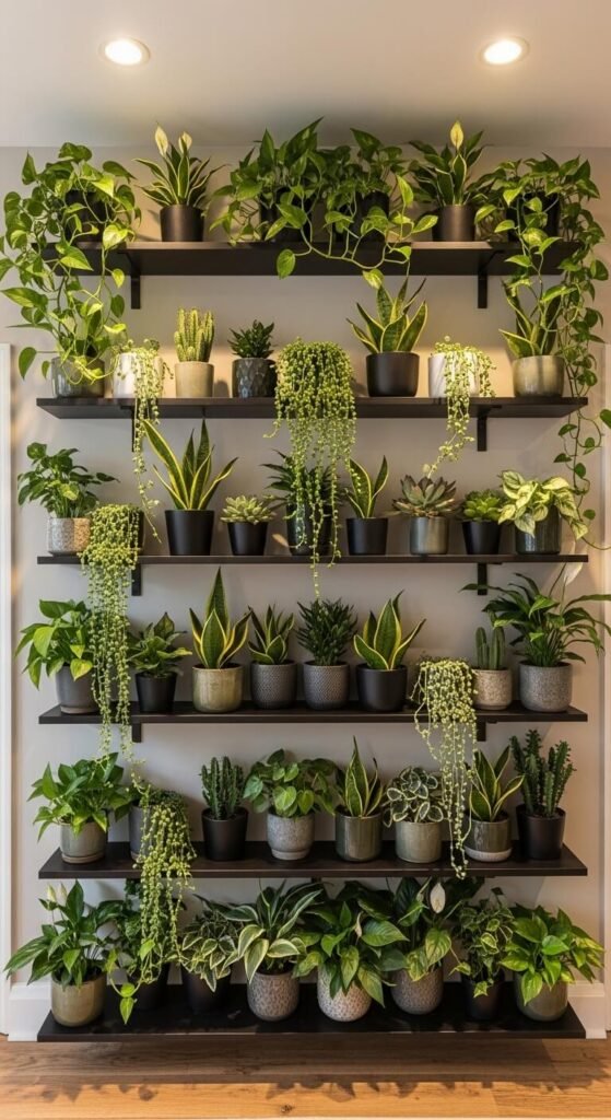 This is the arrangement for people who genuinely love plants and want their home to reflect that completely. Install floating shelves at multiple heights across one full wall. Fill every shelf with plants at different scales — tall, trailing, small, sculptural.