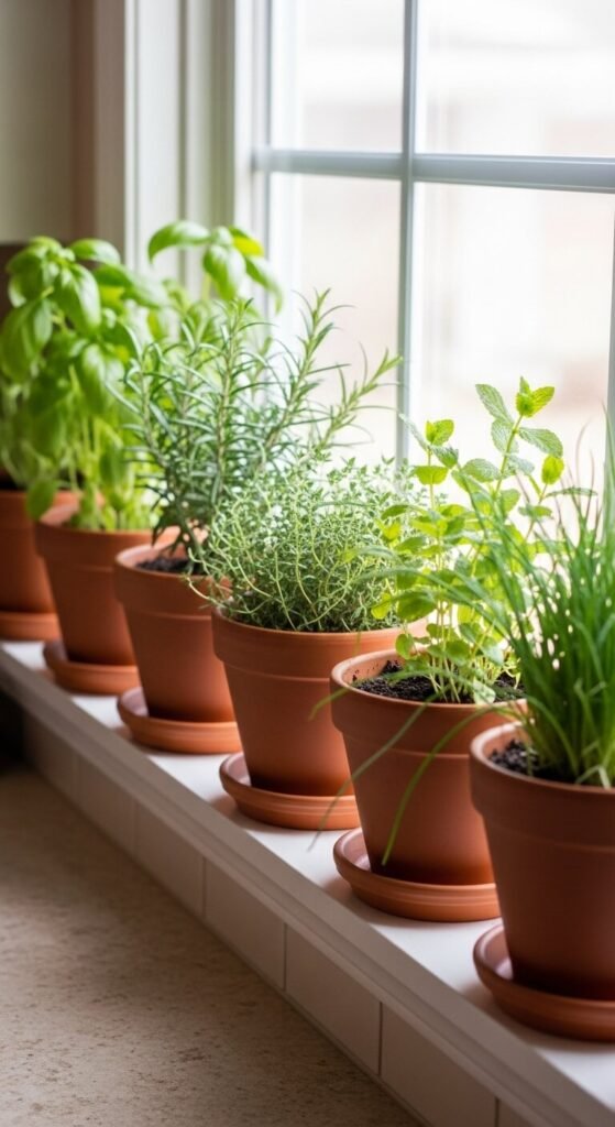 Fresh herbs on the windowsill look beautiful and get used every day. Basil, rosemary, thyme, and mint all grow well in small terracotta pots with a sunny south-facing window. They cost $2–$4 each as seedlings from a grocery store or garden center.