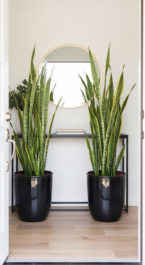 Buy two plants the same height and pot them identically. Symmetry is the whole point here. Snake plants cost $10–$30 depending on size, tolerate irregular watering, and filter airborne toxins while looking sculptural and sharp.