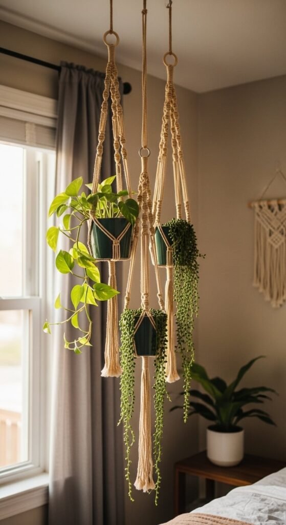 Macramé hangers suspend plants at eye level or above, drawing the eye upward and creating vertical interest that shelves and tables can’t. They work in living rooms, bedrooms, bathrooms, and any space with a ceiling hook or curtain rod to hang from.