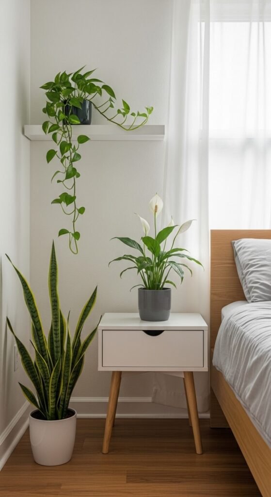 Arrange them at different heights for visual interest — one on the floor, one on the nightstand, one on a shelf. No bright light required for any of these three. Total cost for all three plants: $25–$40. The return in air quality and aesthetics is far greater than the investment.