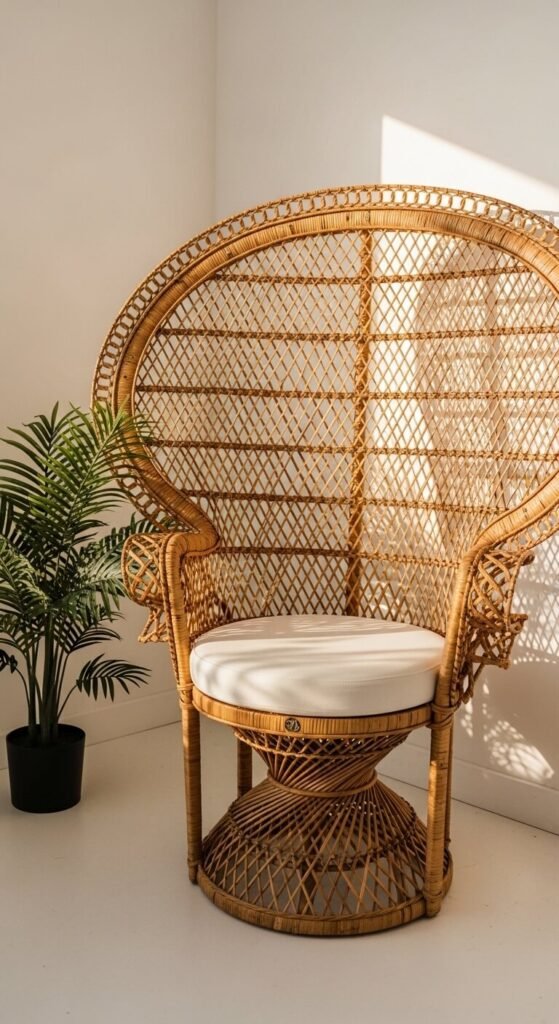 The rattan peacock chair is the most iconic tropical rattan piece in home decor. Its dramatic fan-shaped back makes a statement without needing anything around it. Place one in a bedroom corner, a reading nook, or even outdoors on a covered porch. Pair with a simple round cushion in white, cream, or a bold tropical print. These chairs cost $120–$250 new, but secondhand options at thrift stores and Facebook Marketplace are common for $30–$80. Sand and reseal any worn finish for under $15. One chair transforms an entire corner.