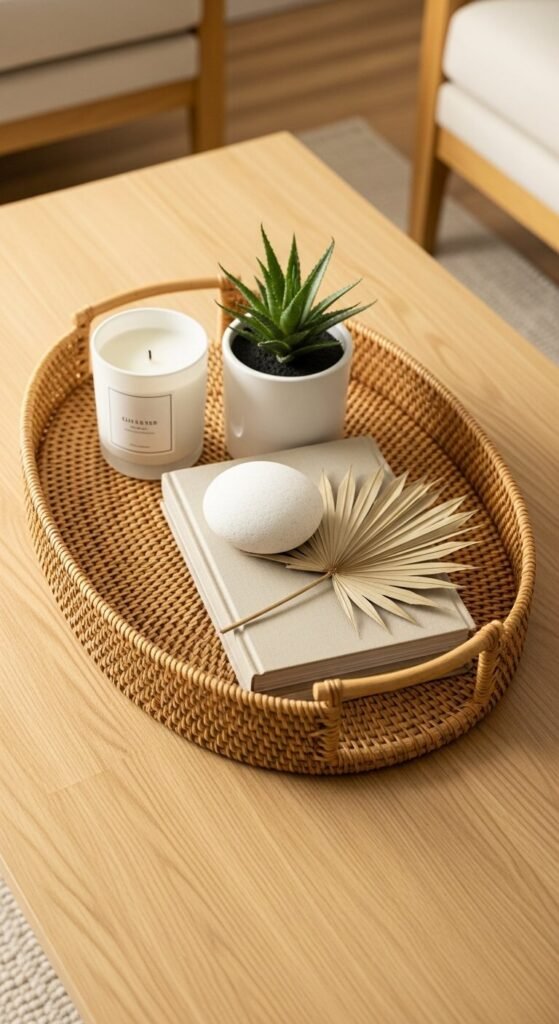A rattan tray creates an organized, styled surface on a coffee table, ottoman, or dresser without requiring multiple separate accessories. Place everything inside the tray and the arrangement looks intentional. Use it to hold a candle, a small plant, a stone, and a book. The tray does the editing work. Natural rattan trays with a low rim cost $20–$40 at most home stores. Round or oval shapes work best on coffee tables; rectangular ones suit kitchen islands or dressers. One tray can make a cluttered surface look like a deliberate display.