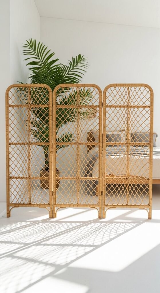 A rattan room divider brings tropical texture to an open-plan space while creating visual separation between zones. The open weave lets light pass through so the room does not feel cut off or smaller. Three-panel rattan screens work well in studio apartments, large bedrooms, and open living areas. They require no installation — just position and adjust as needed. Rattan divider screens cost $70–$140. If budget is limited, a single large rattan panel leaned against a wall works as both a room feature and a soft divider between a workspace and a relaxing area.
