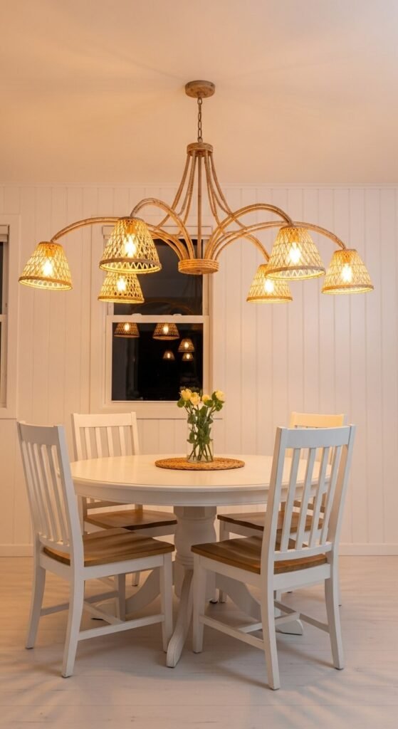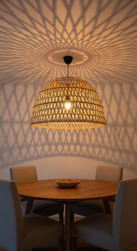A rattan pendant light over a dining table immediately sets a tropical, resort-like tone. The open weave casts shadow patterns that change with the angle of light — no other shade material does this. Wide dome shapes work best over round or rectangular dining tables. Standard pendant wiring fits most rattan shades, so swapping a basic fixture is a manageable DIY project. Rattan pendant shades start at $50–$90. Pair with a warm 2700K bulb for the most atmospheric result. The combination of woven texture and soft light does more for a dining room than most furniture changes.