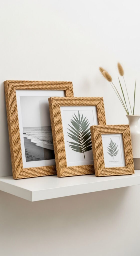 Rattan picture frames replace plain wooden or plastic frames with something that has actual warmth and character. A cluster of three rattan-framed photos on a shelf or gallery wall immediately reads as tropical without being kitsch. Look for frames with a flat, tightly woven rattan border that does not compete with the image inside. Standard 4×6, 5×7, and 8×10 sizes are widely available for $15–$30 each. Mix tropical photography — beach shots, botanical prints, palm leaves — with the rattan frames for a cohesive display that feels personal and considered.