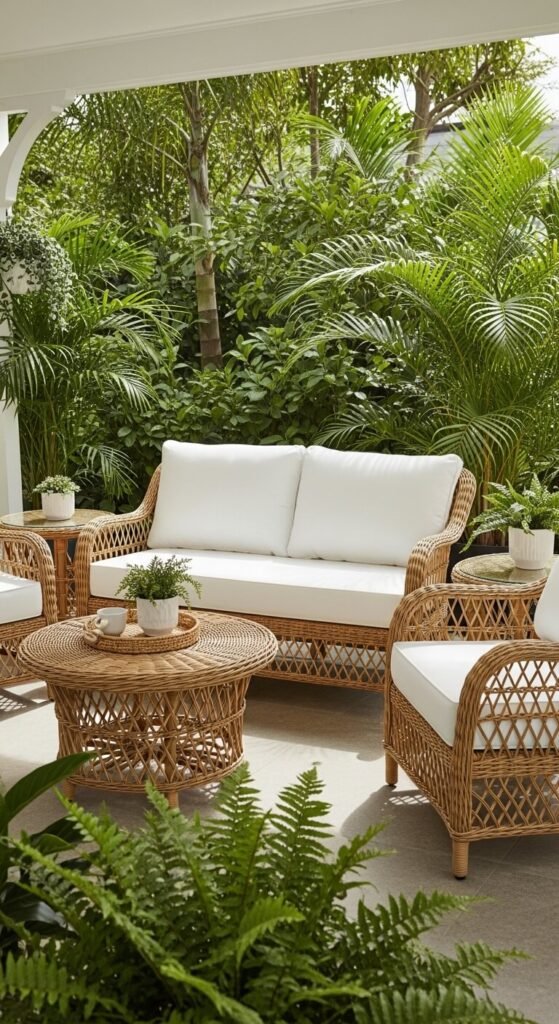 An all-weather rattan outdoor sofa set turns a porch or patio into a genuine outdoor room. Look for sets made with resin or PE rattan rather than natural rattan for outdoor use — these handle sun, rain, and humidity without cracking or fading. A sofa-and-two-chairs set costs $300–$600 for a solid quality option. Cushion covers in off-white, sand, or a simple stripe are the easiest to replace when they eventually fade. If a full set is outside budget, start with two armchairs and a rattan side table for under $200 and add to the set over time.