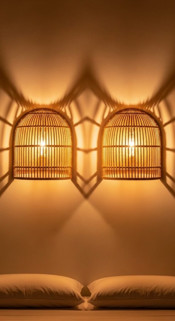 Rattan wall sconces add soft ambient light and natural texture to a bedroom or hallway without taking up floor or table space. Half-dome or cone shapes in open-weave rattan cast the most interesting light — the shadows they project onto the wall become part of the decor. Plug-in wicker sconces are the easiest option for renters since they require no wiring — just mount with a small hook and run the cord to a nearby outlet. Rattan sconces cost $30–$70 each. Mounted symmetrically on either side of a bed, a pair replaces two bedside lamps entirely.
