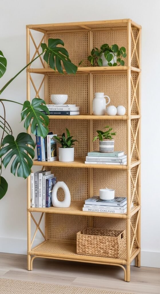 A rattan bookshelf or etagere adds warmth to a living room wall that a standard white or wood shelf cannot match. The woven rattan backing on each shelf panel creates texture behind your displayed objects — books, plants, and ceramics all look better against wicker than they do against painted MDF. Open rattan shelving units cost $100–$200 for a full-height piece. If that is outside budget, look for rattan-insert shelving panels at craft stores and replace the solid backing of an existing IKEA-style shelf unit for a similar effect at a fraction of the cost.