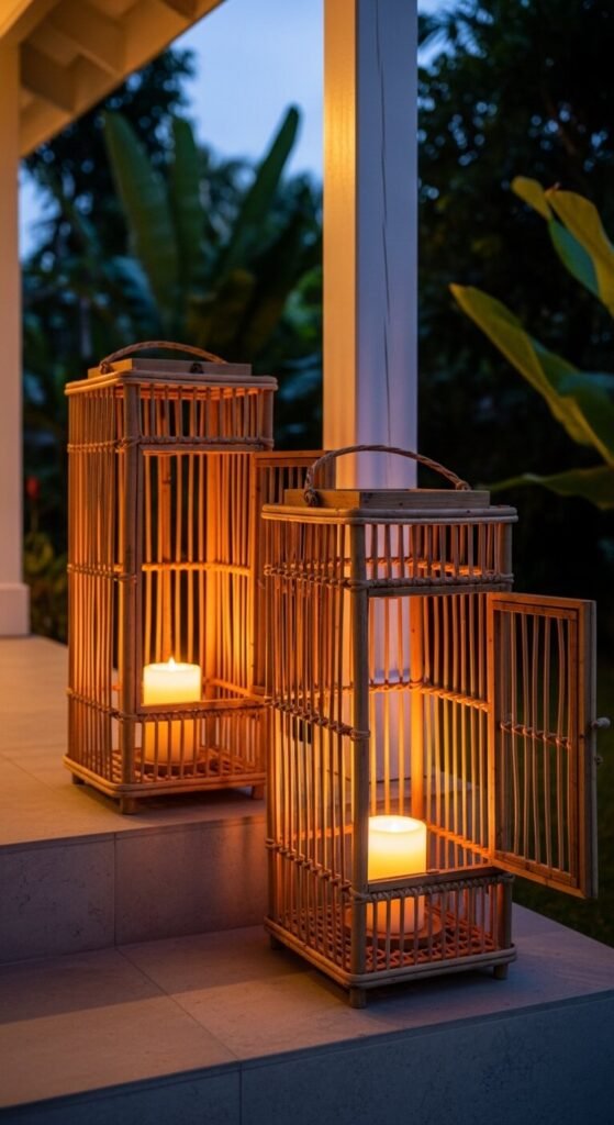 Rattan lanterns with open-weave sides are particularly well suited to tropical settings because the natural material and the candlelight together create a warm, island-resort atmosphere. Use them on a porch, a patio dining table, or an indoor mantelpiece. Look for rattan lanterns with a hinged door or open top for easy candle placement and replacement. Sizes range from small tabletop versions at $20–$35 to large floor lanterns at $60–$90. Group two or three in different heights for a stronger visual effect. Battery tea lights work well inside for a no-flame option that is just as warm-looking.