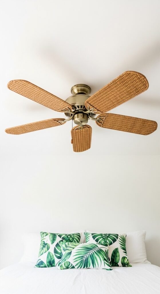 A rattan ceiling fan combines function and tropical decor in a single overhead fixture. Woven rattan blades in natural tones look dramatically different from standard painted wood or plastic blades — they bring warmth and texture to a ceiling that flat surfaces ignore entirely. Look for fans with a brushed brass or matte black motor housing to complement the natural rattan. These cost $150–$300, making them a more significant investment — but the combination of practical airflow and decor impact is hard to match. Pair with white ceiling and walls to make the rattan blades the clear focal point.