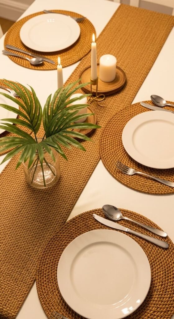 Rattan or seagrass woven placemats are the easiest and most affordable way to bring a tropical texture to a dining table. A set of four oval or round rattan placemats costs $15–$30. Pair with white ceramic dishes and simple glassware — the contrast of natural rattan and clean white makes a table look effortlessly resort-like. Add a matching rattan table runner down the center for under $20 more. This entire table styling change costs under $50 and takes five minutes to set up. Switch them out seasonally or use them year-round as a permanent natural texture base.