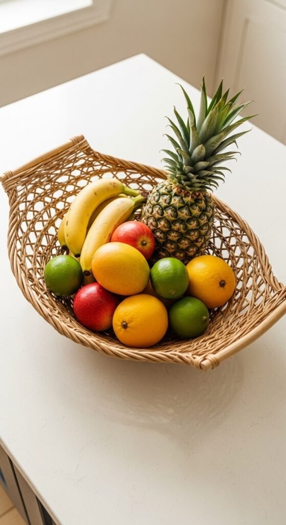 A rattan fruit bowl is one of the most affordable tropical decor touches for a kitchen. The open weave, warm tone, and organic shape work especially well when filled with tropical fruits — mangoes, limes, a pineapple, or bananas. Wide, shallow oval forms display fruit better than deep bowls and are easier to grab from. Natural rattan fruit bowls cost $15–$35. Even when the bowl is not filled with exotic fruit, the rattan texture alone reads as tropical against a kitchen counter. It is a functional piece that earns its place on the counter every single day.