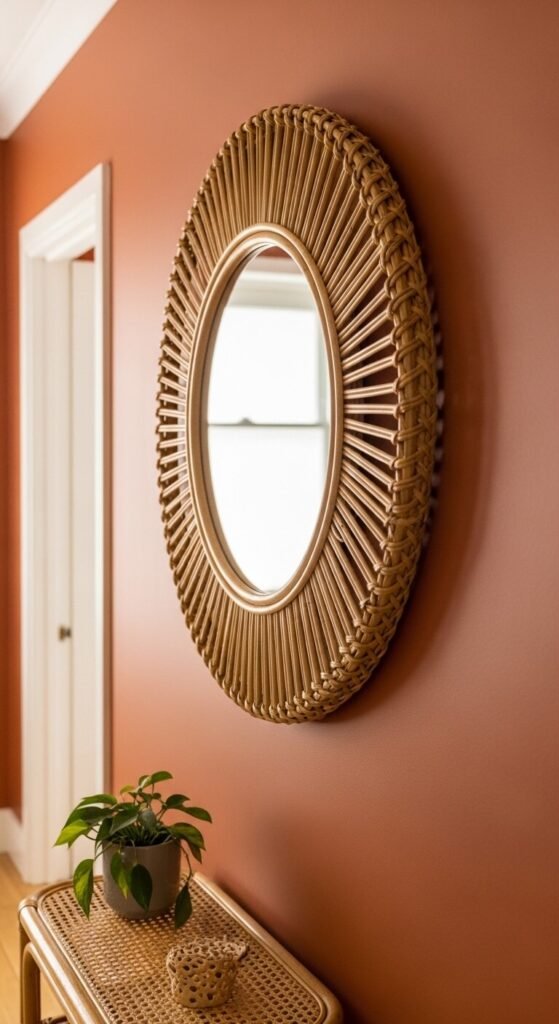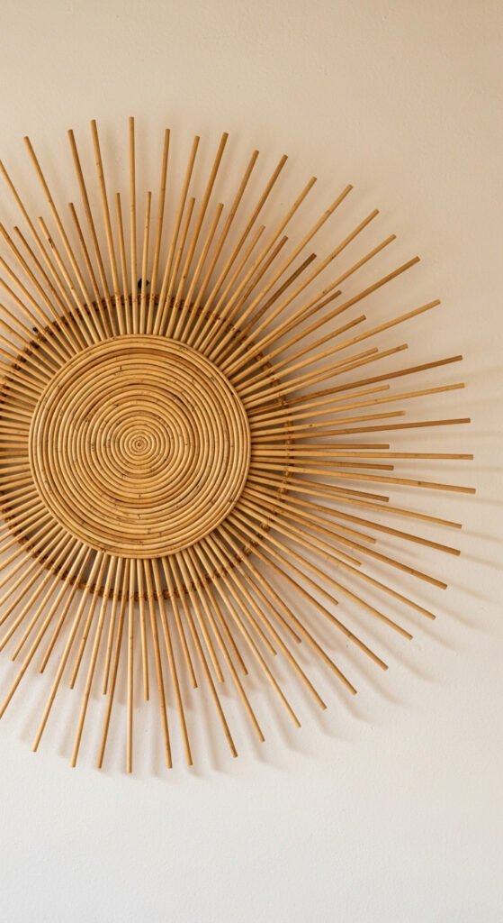 A rattan sunburst wall piece is a purely decorative object that adds scale, texture, and a tropical feeling to any wall. The radiating form works especially well in living rooms and entryways where you want a single piece to anchor the wall without requiring a full gallery arrangement. Rattan sunburst wall art ranges from 18 inches to 48 inches in diameter and costs $35–$90. For a DIY version, bundle natural rattan reeds of graduated lengths around a central wooden ring using hot glue and natural twine — the materials cost under $20 at a craft store.
