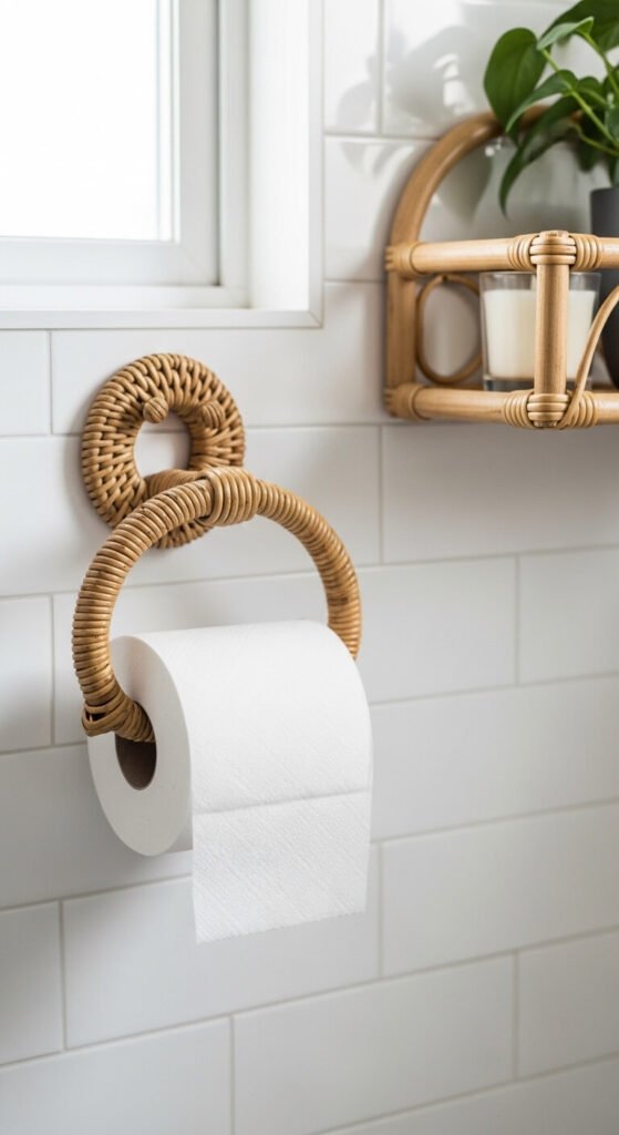 A rattan toilet paper holder or towel ring is a small bathroom hardware upgrade that signals a deliberate tropical aesthetic. These small accessories replace generic chrome or plastic hardware with natural woven texture. Individual rattan bathroom accessories — a toilet paper holder, a towel ring, a small shelf — cost $15–$35 each. Buy two or three in the same rattan weave style to create a cohesive bathroom set. Combined with white tiles, natural stone surfaces, and a small potted tropical plant, these small rattan details can transform a plain white bathroom into something that feels warm and considered.