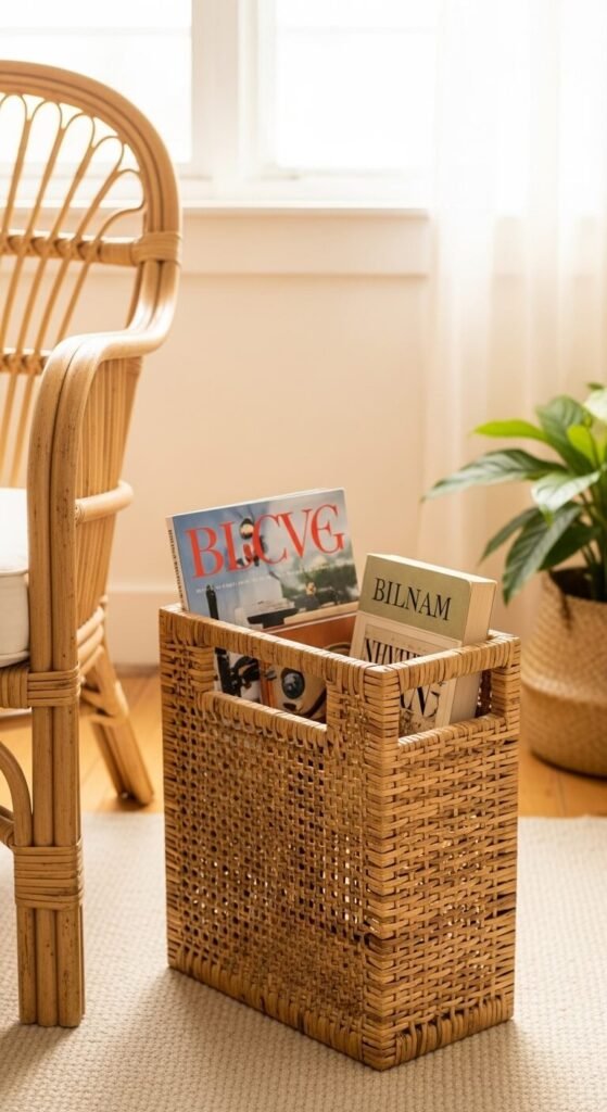 A rattan magazine rack keeps reading material organized beside a chair or sofa without looking like an afterthought. Tall, slim rectangular rattan baskets hold items upright so spines are visible. Look for racks with reinforced sides — the basket should not bow outward as it fills. Natural rattan styles cost $20–$40. Place one beside a rattan armchair or hanging swing chair to complete a reading corner that feels entirely cohesive. The combination of a rattan seat and a rattan rack is one of the simplest ways to create a fully themed tropical corner without overdecorating the rest of the room.