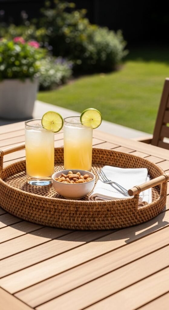 A rattan serving tray with handles makes entertaining feel more considered and tropical without requiring any other styling. Use one to carry drinks from a kitchen to an outdoor table or to display items on a console. The natural texture of the tray lifts even simple drinks and snacks visually. Look for trays with solid wooden or rattan handles that grip securely. Large serving trays cost $30–$55. This piece works equally well as a display tray when not in use for serving — set it on a side table or ottoman and style it with a candle, a shell, and a small plant.