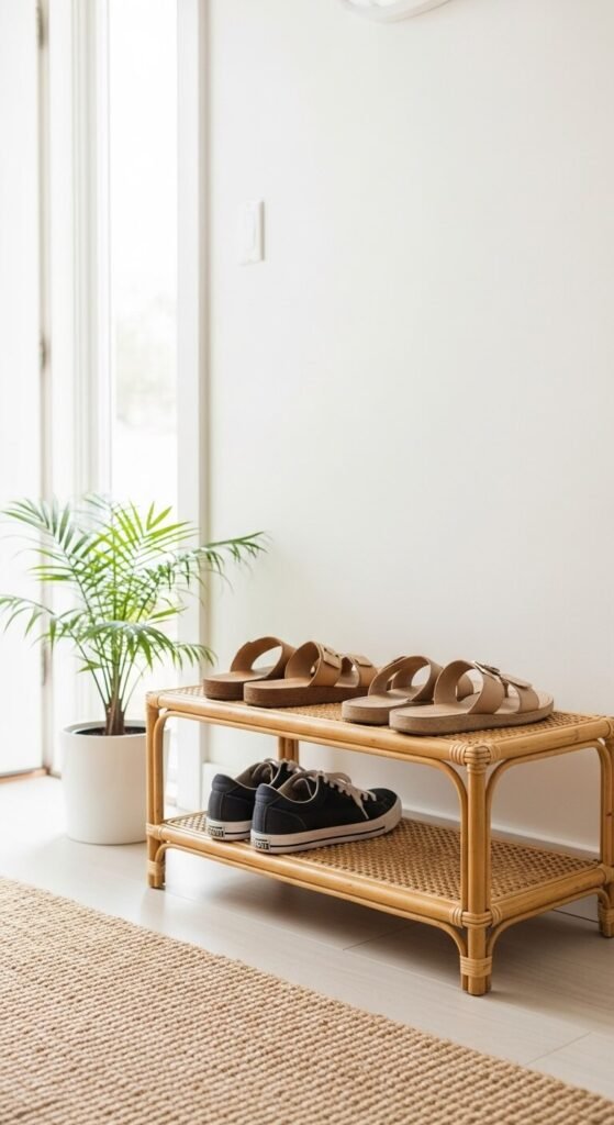 A rattan shoe rack in an entryway keeps shoes organized while adding a tropical, relaxed tone to the first room guests see. Low, open-weave rattan racks let shoes air out, which is more practical than enclosed cabinets — especially in warm climates. Two-tier rattan shoe racks hold six to eight pairs and cost $35–$60. Pair with a small potted palm, a rattan mirror on the wall above, and a jute rug underfoot. This combination creates an entryway that feels like a boutique resort check-in — warm, natural, and welcoming with very little money spent.