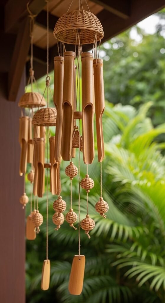 Rattan and bamboo wind chimes bring sound and texture to an outdoor porch or garden space. Unlike metal chimes, rattan and bamboo produce a softer, woodier sound — closer to the ambient noise of a tropical setting than a traditional wind chime. Hang them from a porch beam or garden hook where they will catch a regular breeze. Sets cost $20–$45 from garden stores and online retailers. You can also make a simple version by threading rattan beads and bamboo sections onto natural twine and attaching them to a short driftwood bar — total DIY cost under $15.