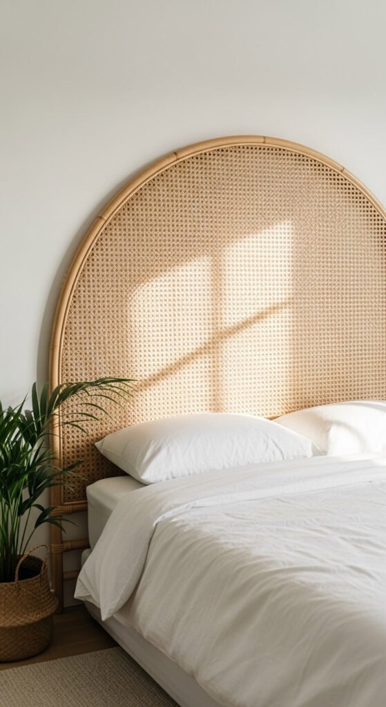 A rattan headboard gives a bedroom a tropical resort quality that painted walls and plain upholstery cannot match. Arched forms in natural rattan are the most popular — the shape is architectural and the texture adds depth. Many rattan headboards are freestanding and lean against the wall, so no drilling is required. Prices range from $90–$200 for queen sizes. Pair with white or warm linen bedding to let the rattan read clearly. Add one small potted palm or tropical leaf print nearby and the room takes on a complete island character.