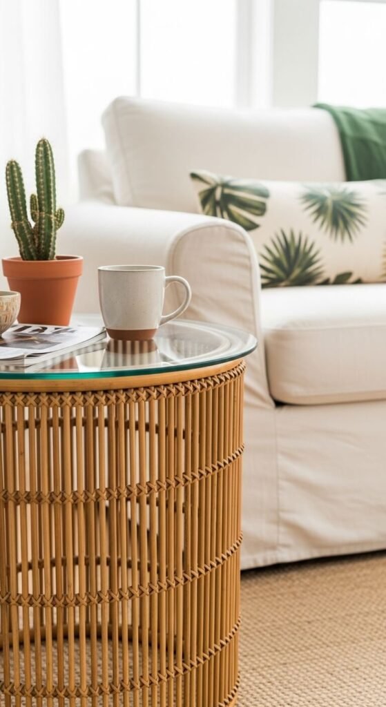 A rattan side table with a glass or wood top brings tropical texture to a seating area without adding visual weight. The glass top makes the surface practical — you can rest drinks without worrying about the weave. Round rattan side tables work well beside sofas, armchairs, or as a bedside alternative to a standard nightstand. Prices start at $60–$120 for new pieces. Secondhand rattan tables are common at thrift stores and garage sales — often needing only a clean and a coat of clear varnish to look great again. A $10 DIY fix gives them years more life.
