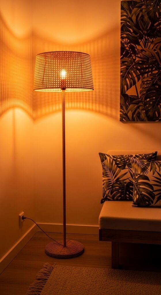 A rattan floor lamp brings warm, ambient light and natural texture to a living room or bedroom corner at the same time. Look for lamps with a rattan-wrapped base and a woven rattan or paper shade — these cast the warmest, most diffused light. Pairing a rattan lamp with a warm 2700K bulb creates the kind of golden evening atmosphere that makes a room feel like a vacation rental. Floor lamps with rattan detailing cost $80–$150. A simpler DIY option: wrap a plain floor lamp base with thick rattan ribbon using craft glue for under $25.