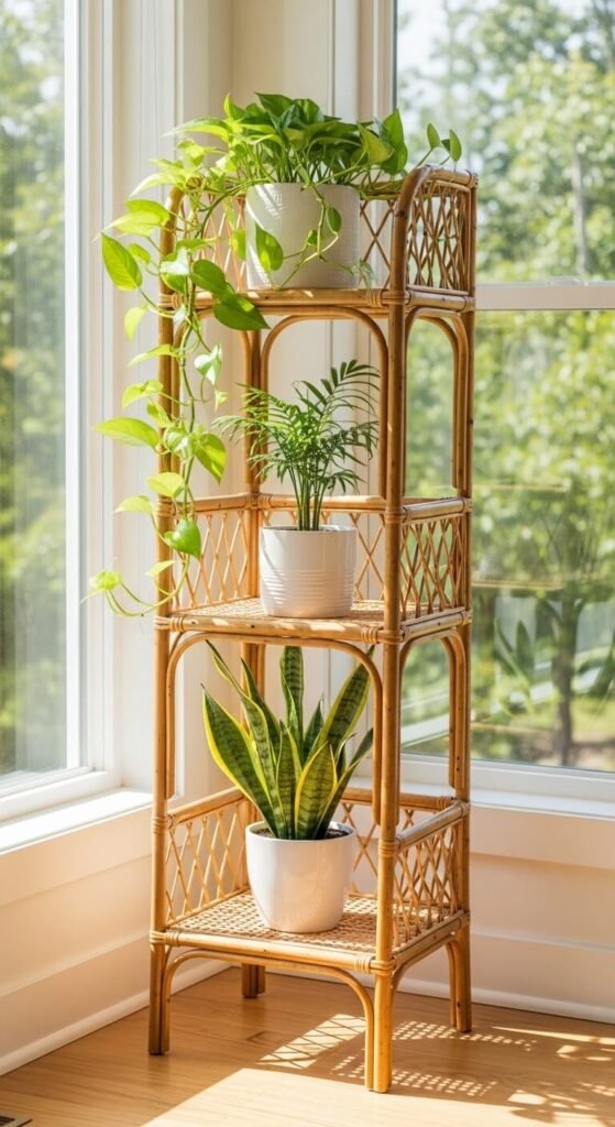 A rattan plant stand lets you display multiple plants at different heights, which adds visual rhythm and fills a corner without crowding the floor. Three-tier designs work especially well with tropical plants — mix a trailing pothos on top, a small palm at mid-level, and a low spreading plant at the base. Natural rattan stands cost $35–$70 for a three-tier option. If budget is tight, stack two or three different-height wicker baskets under plants for a similar layered effect. The layered height makes even three small plants look like a real indoor garden.