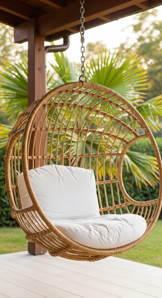 A hanging rattan swing chair is one of the most impactful tropical decor investments you can make. It turns any corner — indoors or on a covered porch — into an instant retreat. Round bucket designs in natural rattan are the most practical and visually striking. You need a ceiling beam or a sturdy freestanding frame to hang one safely. Swing chairs cost $100–$200. The freestanding frame versions are easier to install for renters and cost an additional $60–$100. Add a round cushion in white, cream, or a simple tropical print to complete the look.