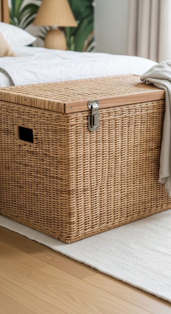 A rattan storage chest at the foot of a bed solves the blanket and extra pillow storage problem while looking like a deliberate decor choice. The flat lid doubles as a surface — add a tray with a small plant and a candle for a styled moment. Look for chests with a reinforced wooden base and metal clasps that will hold up to daily use. Natural rattan trunks cost $80–$150 and last for years with basic care. They also work as coffee tables in smaller living rooms where a seating-height chest functions better than a standard low table.