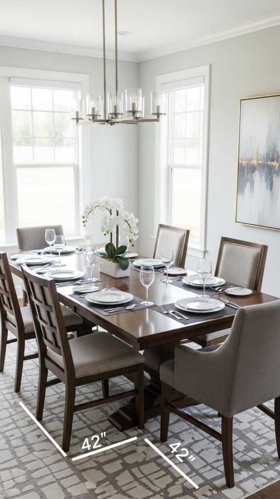 - Dining table: Leave 36-48 inches around all sides for chair pullout and walking