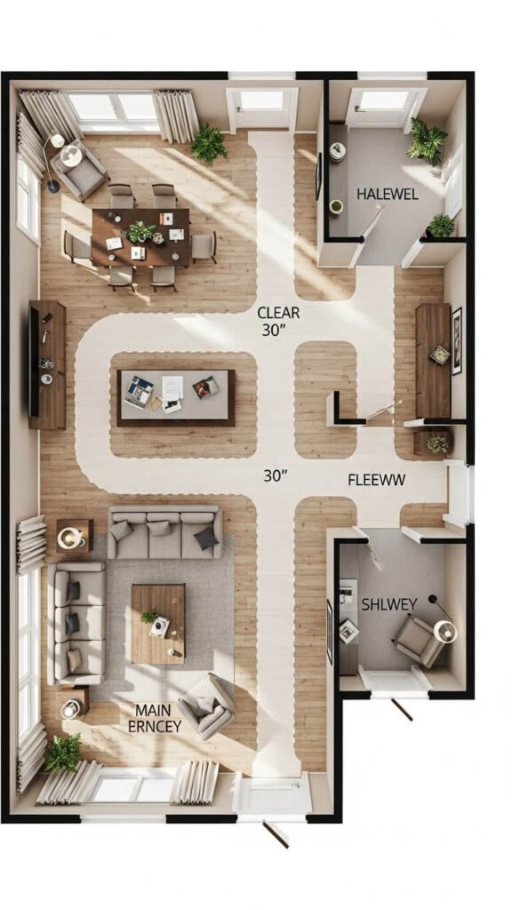 Maintain consistent traffic flow between zones. Pathways should connect spaces naturally, not force awkward navigation.