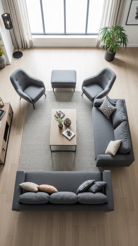 - Distribute large pieces evenly—don’t cluster all heavy furniture on one side