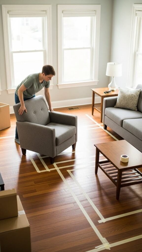 Use painter’s tape to mark furniture positions on the floor before moving heavy pieces. This lets you visualize arrangements without the physical strain of constant rearranging.