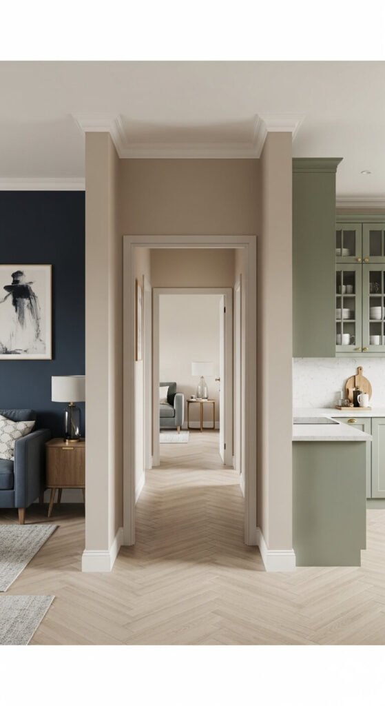 - Navy living room → warm greige hallway → sage green kitchen