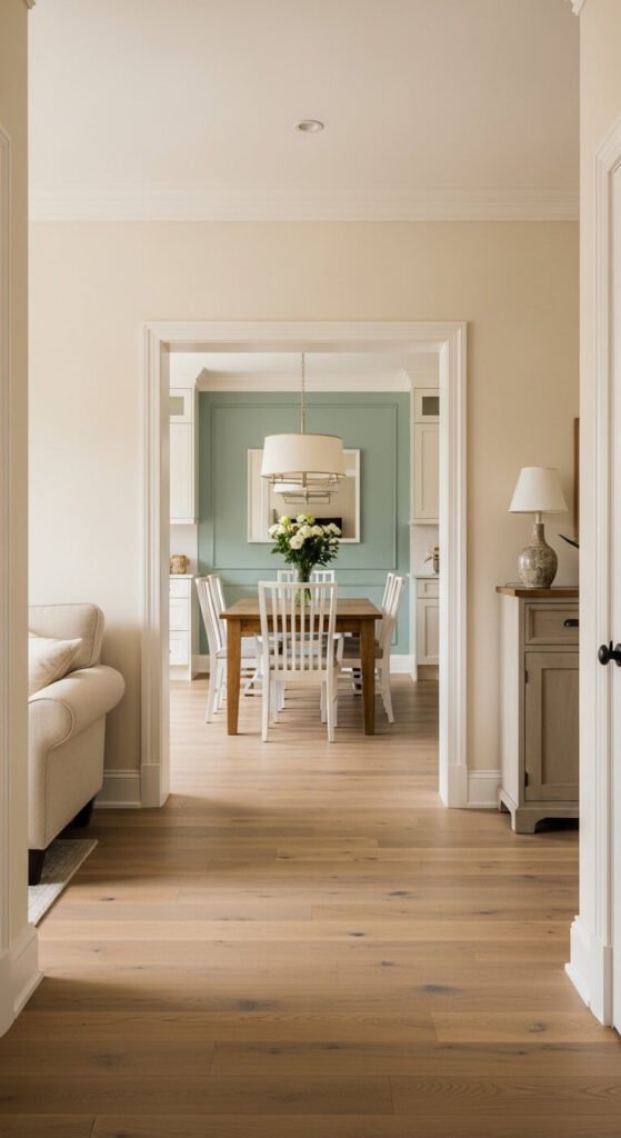 In homes where rooms open directly onto each other — a living room opening to a dining room, a hallway running past multiple doors — the transition between colors is the most visible moment in the whole palette.