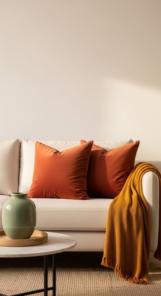 - Think about what you already own — if your sofa is cream and your floors are warm oak, a terracotta accent will feel immediately at home; if your floors are cool grey stone, a dusty sage or slate blue will feel more natural
