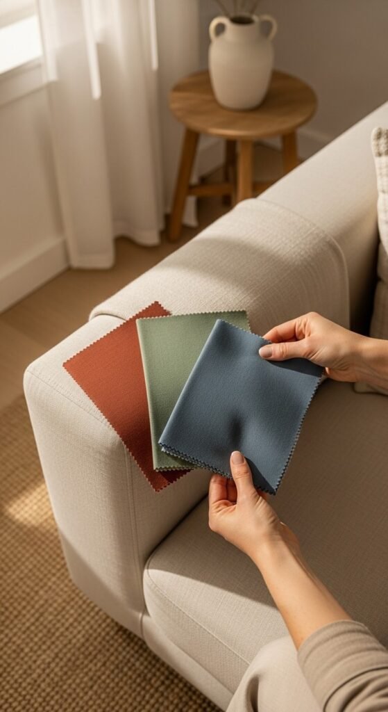 Before buying cushions, painting an accent wall, or investing in a statement rug, test your accent color in the actual room. Cut a swatch of fabric, hold a paint chip, or place a single object in the accent color on the surface you’re considering — and live with it for a day or two. Observe how the color looks in morning light, afternoon sun, and evening lamp glow.