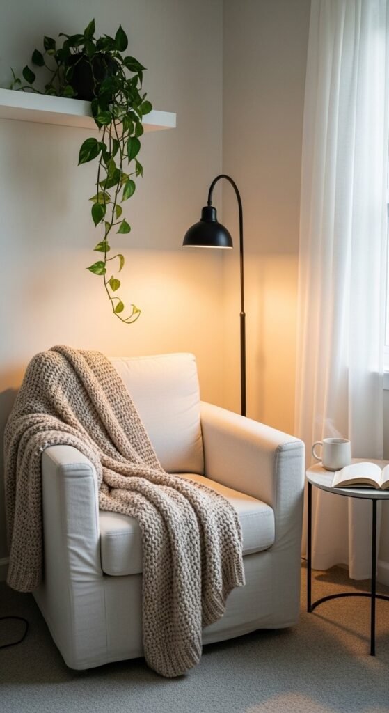 Nothing kills a cozy corner faster than harsh overhead lighting. Warm, layered light is what transforms a seat in a corner into an actual sanctuary. This is the element most people overlook, and it makes an enormous difference.