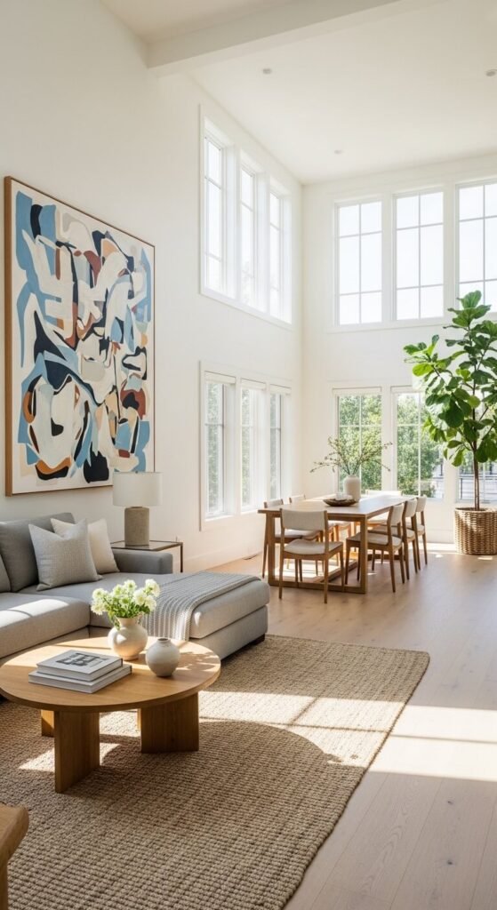 - Think vertically, too — balance isn’t just left-to-right. A room with all low furniture and no tall elements feels flat and unresolved. Add height with plants, floor lamps, or tall art.