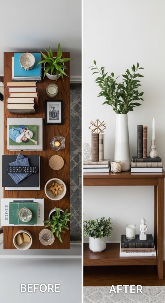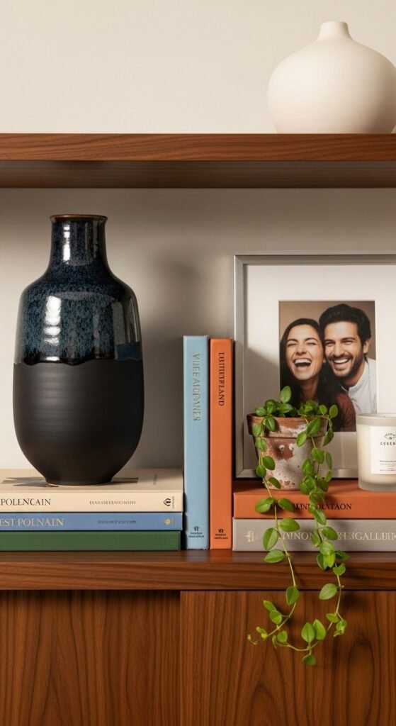 - One low item (a candle, small sculptural object, or trailing greenery)