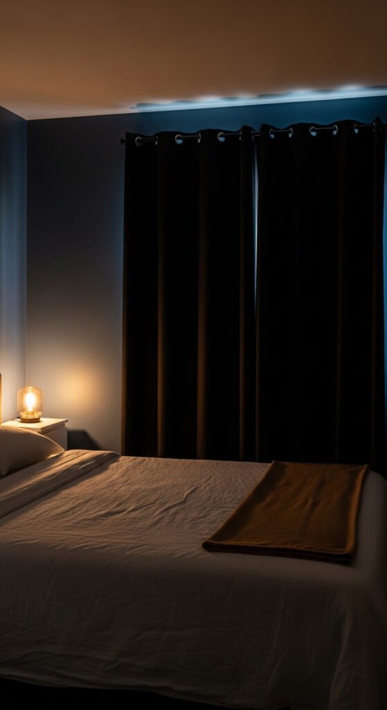 - Blackout curtains or blinds — not “room darkening” or “light filtering,” but genuine blackout. The difference in sleep quality is measurable.