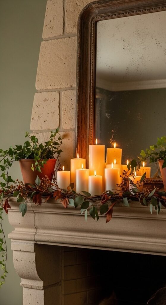 - Abundant candles — pillar candles in clusters at varying heights are the hallmark of a great autumn mantel