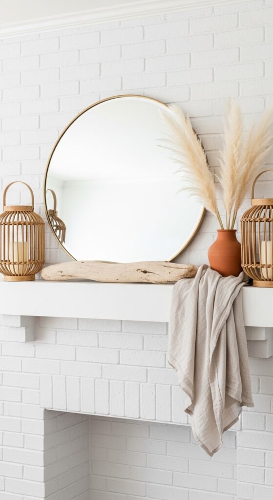 - Garlands and draping — dried leaf garlands, eucalyptus, or magnolia leaf runners draped along the mantel edge