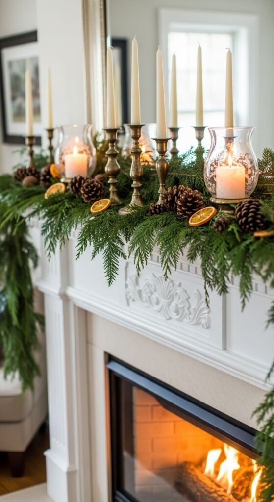 - Evergreen garland — fresh or faux, a full-width drape of greenery is the single most transformative winter mantel move
