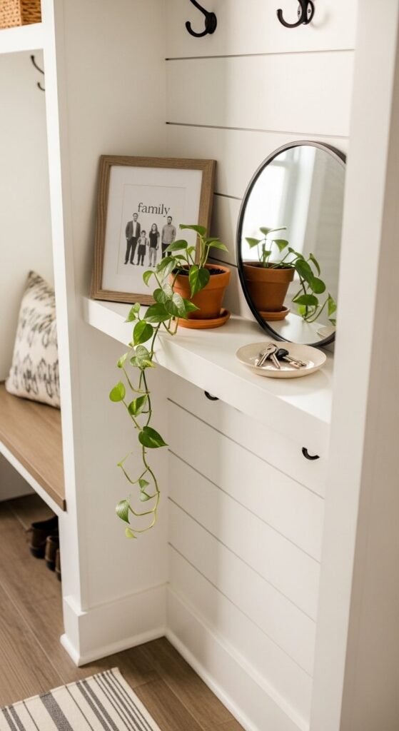 - A small plant or trailing greenery on a floating shelf — choose something hardy like a pothos or snake plant that tolerates the occasional neglect that a busy entry zone guarantees