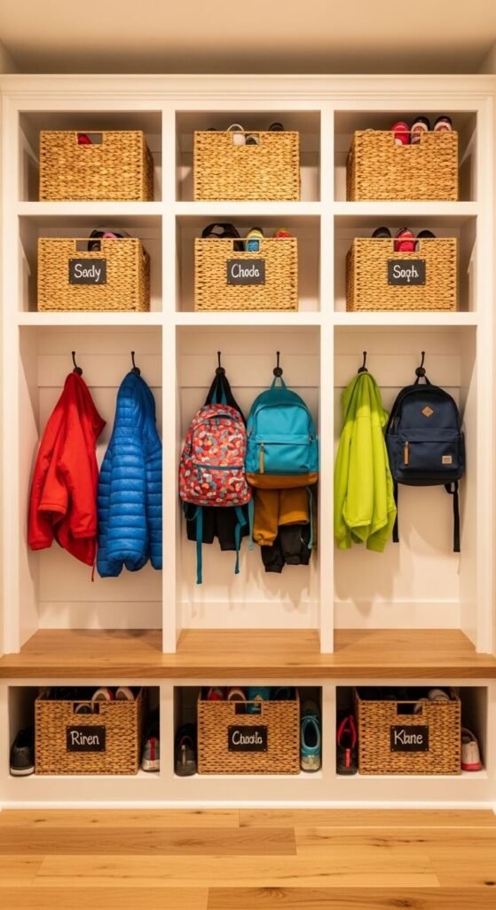 - Give each person their own cubby or basket — shoes, sports gear, and personal items stay in the designated spot; when the basket is full, that person knows it’s time to edit