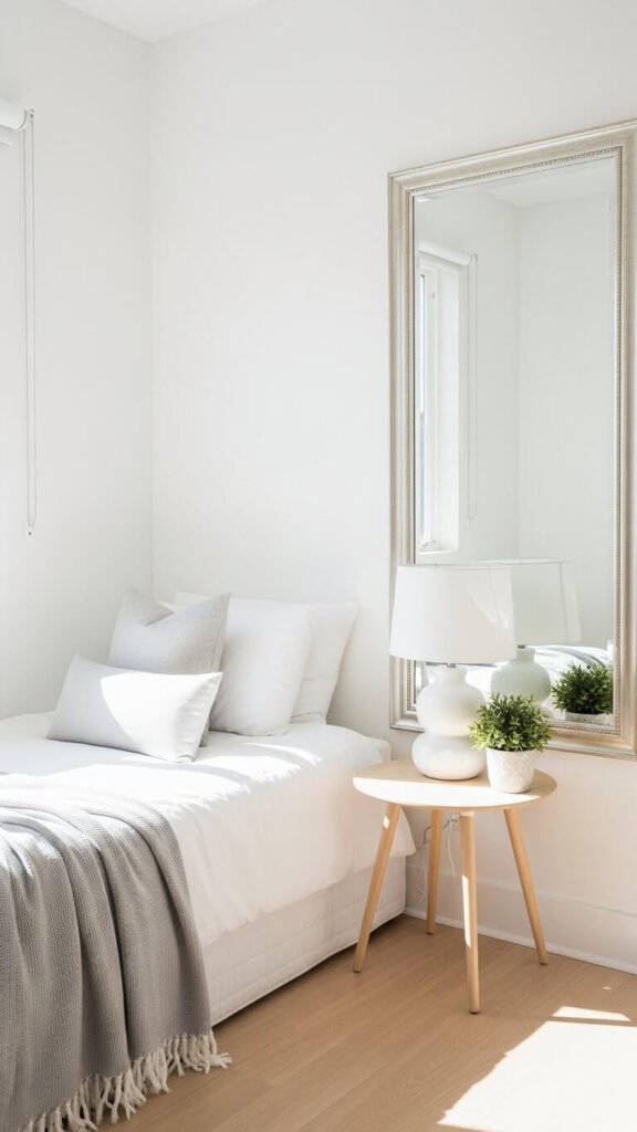 Mirrors are the ultimate space-expanding tool. A large mirror reflects light and creates depth, essentially doubling your visual space.