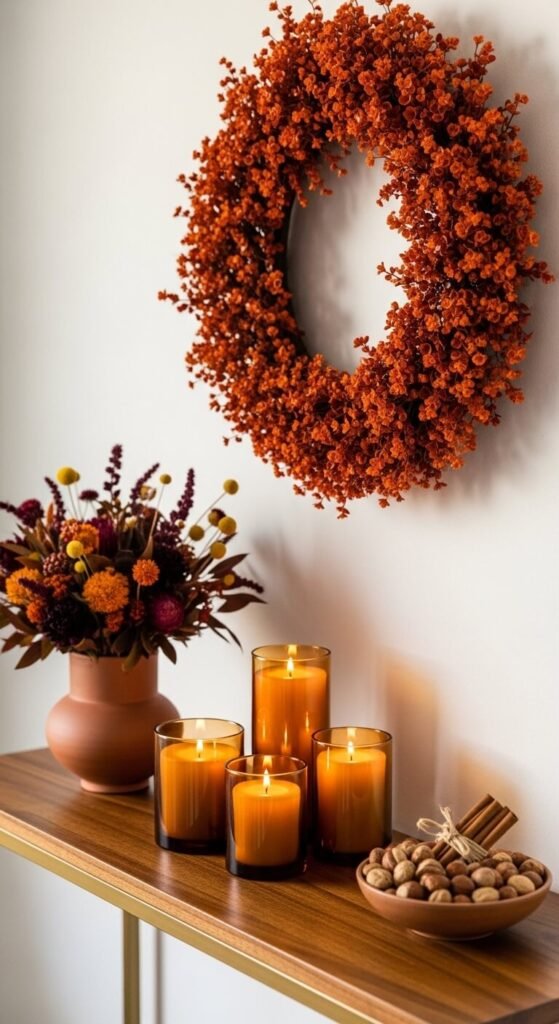 - A tall pillar candle on the console or entry table — a single large candle at the front door signals the season immediately to every person who enters